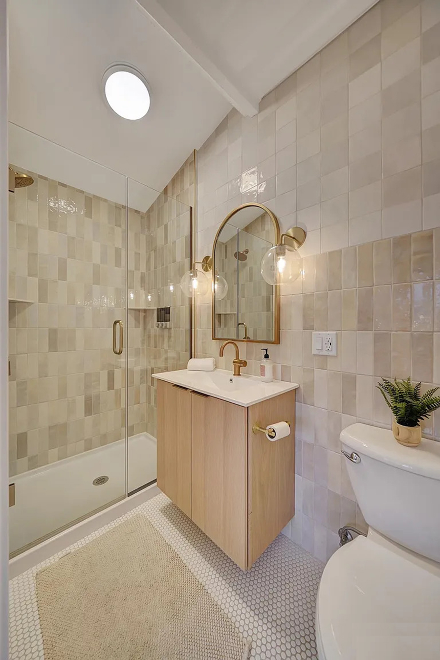 A small potted plant adds life, and soft rugs on the floor keep your feet happy. It’s a bathroom that makes you feel refreshed every single day.