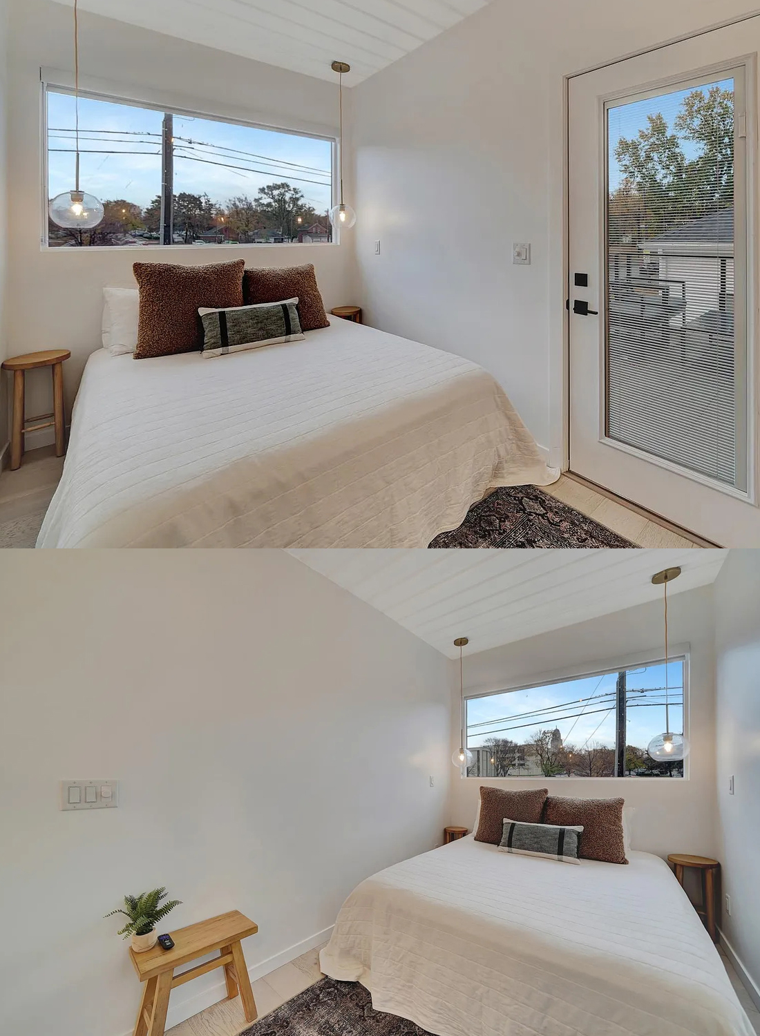 The queen bed is wrapped in crisp white bedding and topped with textured pillows. Each side of the bed gets a small, round table for your book, phone, or a glass of water. Hanging globe pendant lights dangle from the ceiling, giving off a soft, golden glow without taking up table space. The window stretches wide across the far wall, framing the view outside and letting in the morning sun.