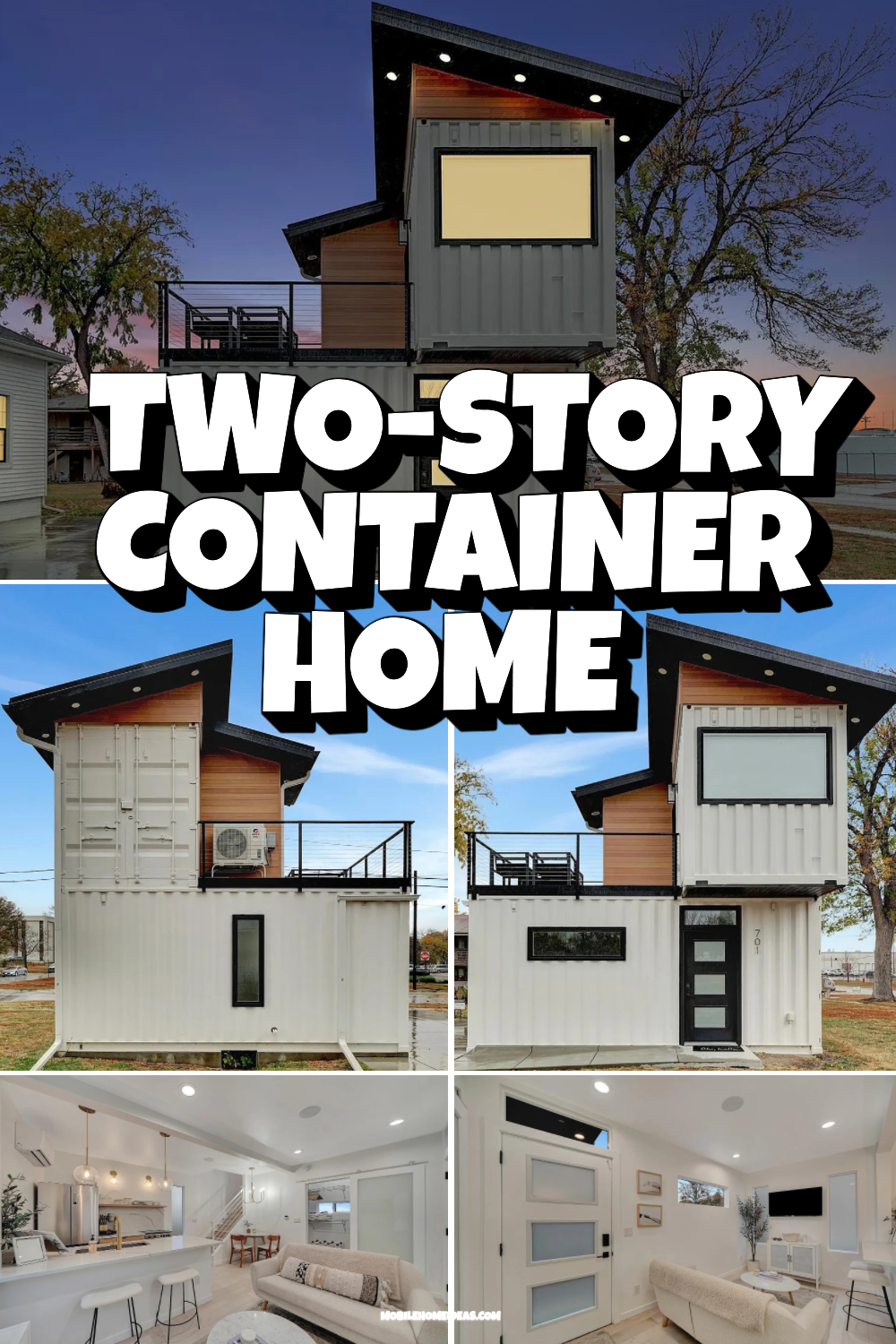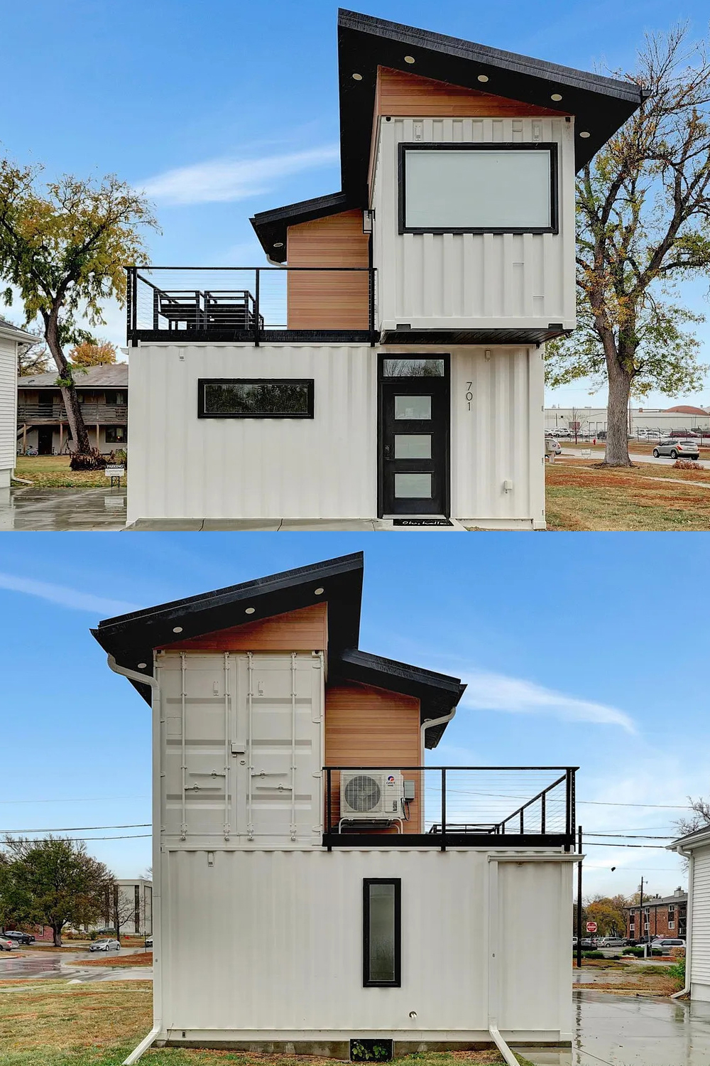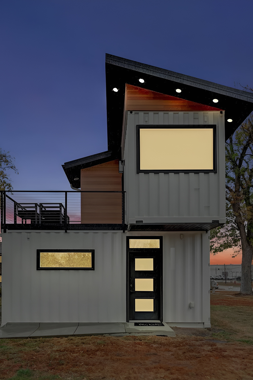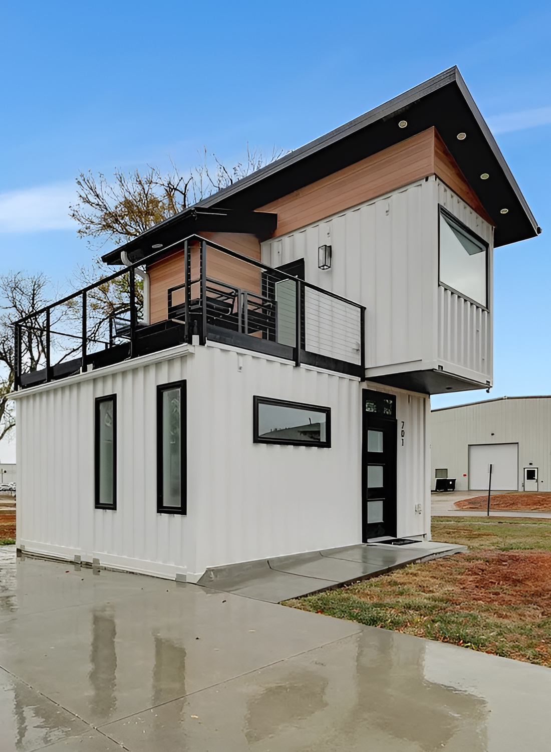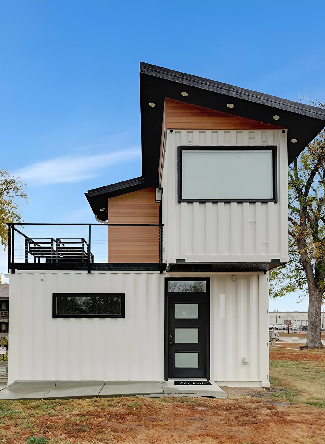 This home stands out before you even reach the door. The white container walls look crisp and clean, set off by bold black trim. The shape of the house grabs your attention right away. Two stacked containers make a striking silhouette, while the sloped roof and wide upstairs window give it a modern edge. The wood paneling tucked beneath the eaves brings a touch of warmth and keeps the look from feeling too industrial.