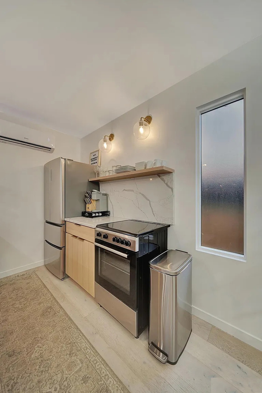 The stainless steel fridge, oven, and dishwasher are all full-size—no skimping here. A built-in microwave fits right under the counter, making the best use of every inch. Open shelves above the stove keep dishes, mugs, and glassware handy. Gold-toned sconces above the shelf add warmth, tying together all the finishes in the room.
