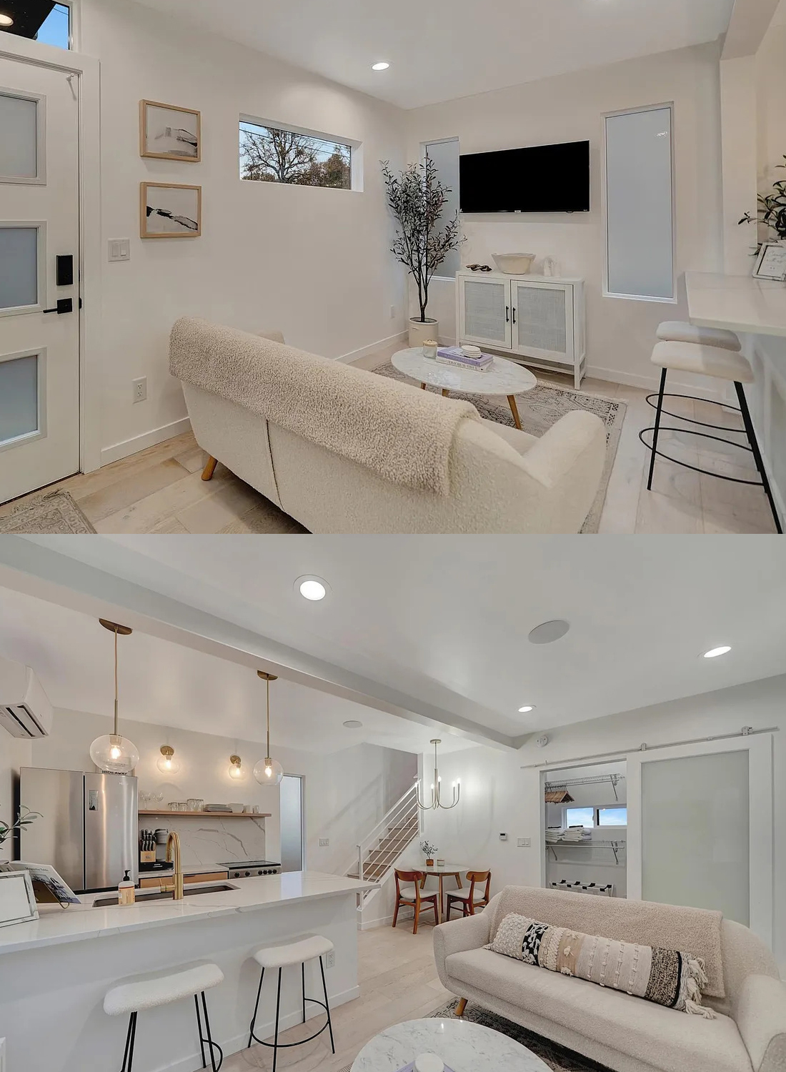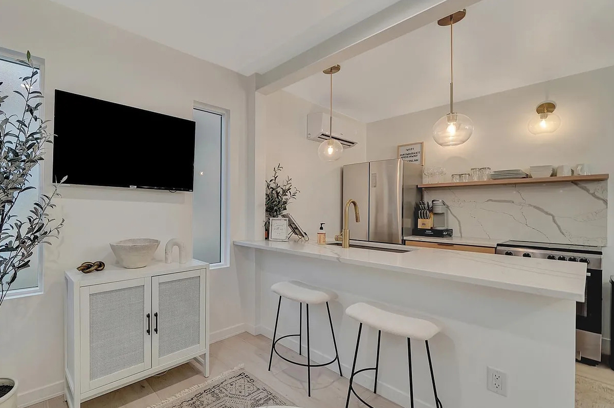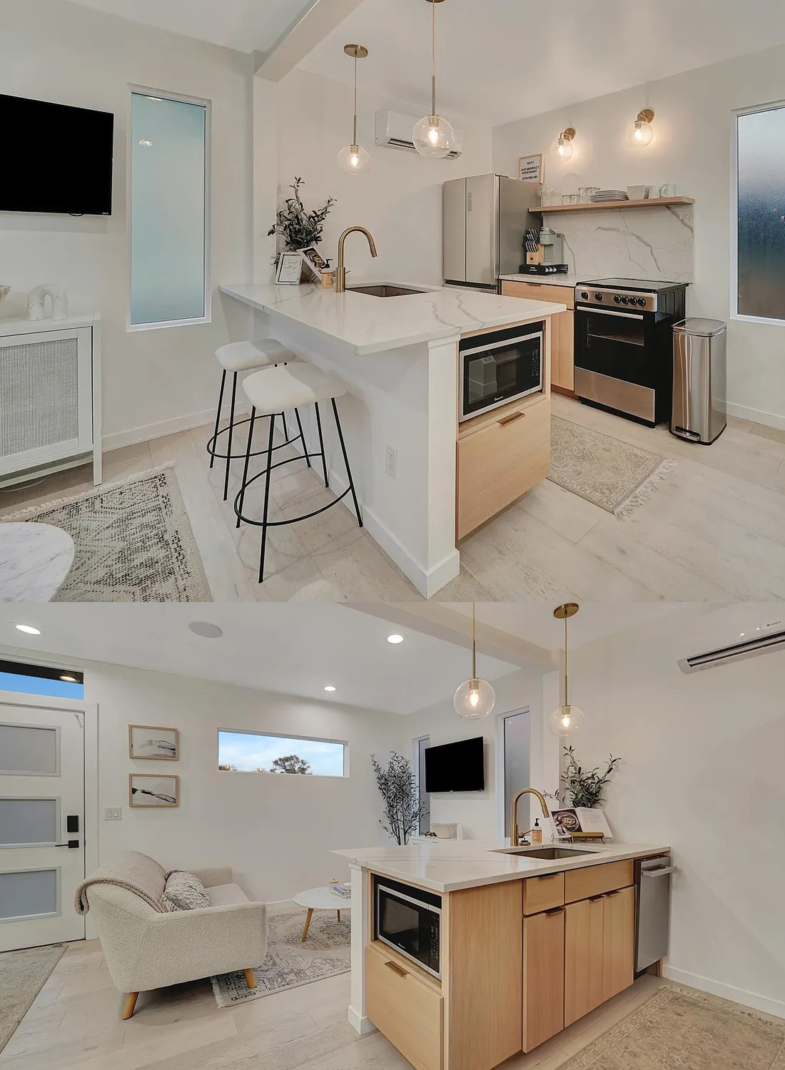 You’ll love how open it feels, thanks to the high ceilings and big windows. The simple color palette of white, light wood, gold, and black keeps things fresh and timeless. Nothing here feels overdone or fussy.