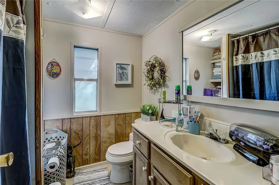 The bathroom continues the cozy theme. It features the same warm paneling on the lower walls, with light paint up top to keep things feeling fresh. There’s a big mirror, a roomy vanity, and lots of counter space for all your daily essentials.