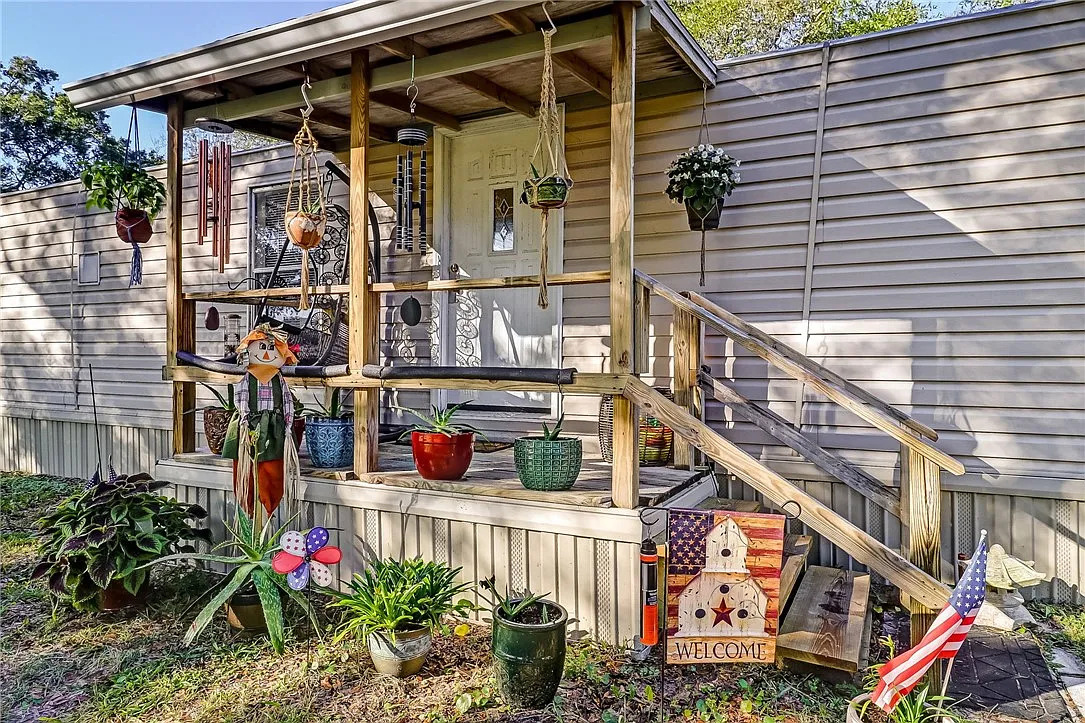 This porch is more than just a spot to take off muddy boots. With its sturdy wood railings and simple roof, it creates a cozy nook perfect for sipping morning coffee or chatting with neighbors. Hanging wind chimes and flower baskets add a touch of movement and music to the space. It’s clear the owners love spending time here.