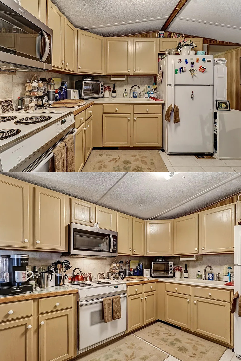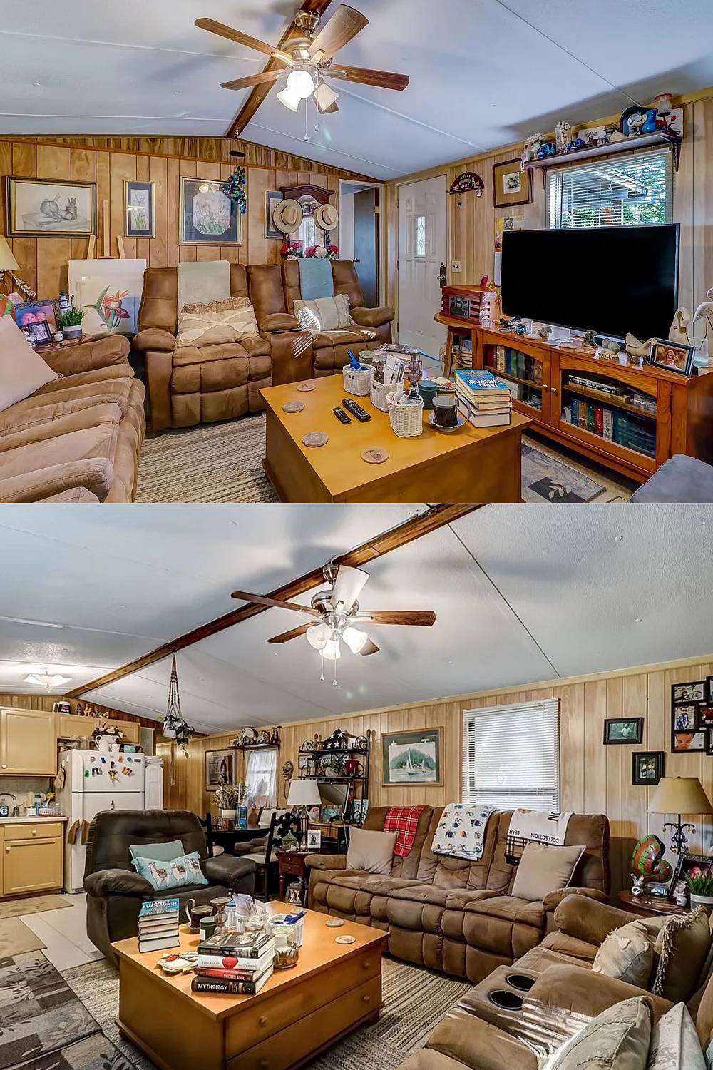 This single wide mobile home proves that you don’t need a big house or a fancy budget to create a space that feels just right. Here, comfort and practicality come first. The warm colors, simple furniture, and personal touches add up to a home that feels welcoming from the minute you walk in.