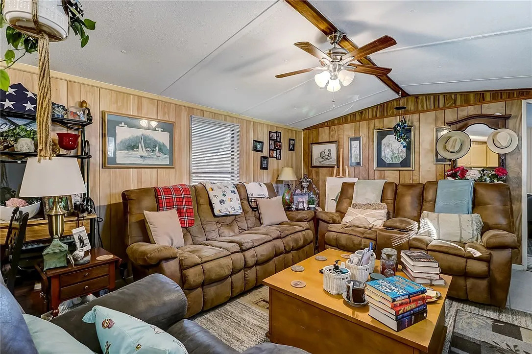 The living room is all about comfort. Plush, overstuffed sofas and recliners fill the space, covered in cozy throws and pillows. A big ceiling fan spins overhead, keeping the air moving. The coffee table is stacked with books, mugs, and little baskets—everything you need within reach.