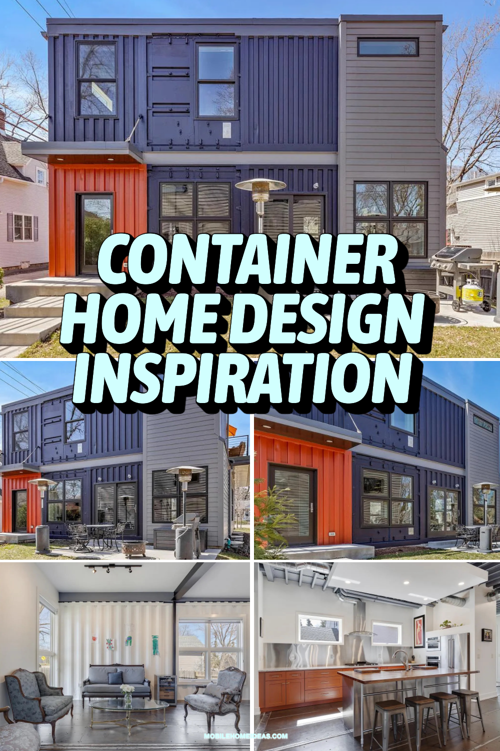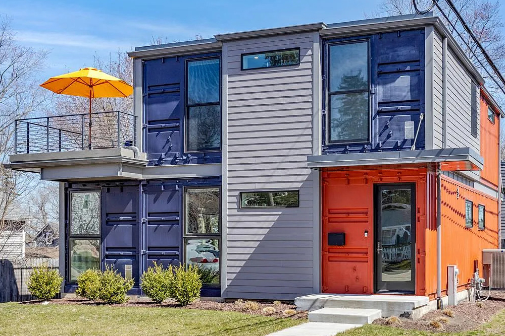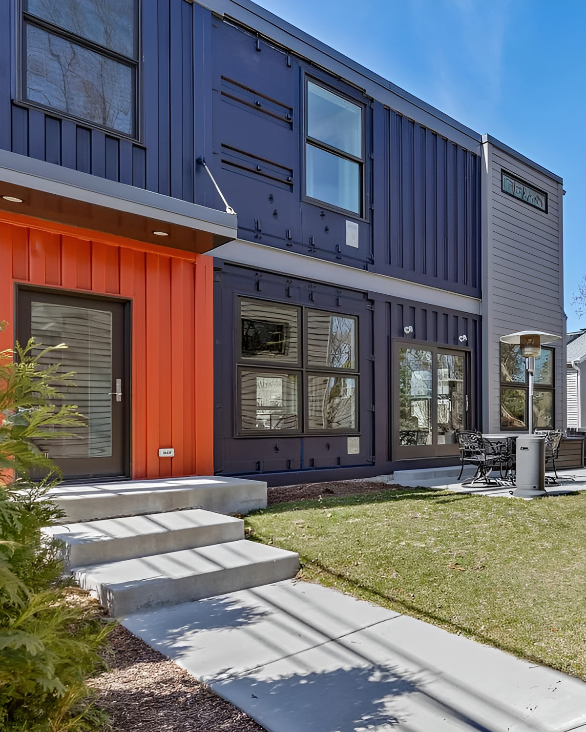 When you walk up to this home, it’s impossible not to notice the bold style. The main building blocks are real shipping containers, stacked and arranged to create a striking modern shape. The colors set the tone—deep navy blue and a vivid, rusty orange catch your eye right away. Paired with smooth gray siding, the home stands out but still feels right at home in the neighborhood.