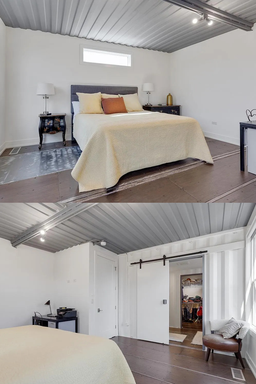 You’ll notice the metal ceiling—a reminder of the home’s shipping container past—but painted in a soft gray so the room still feels calm. There’s space for a dresser and even a cozy corner for reading. Everything feels peaceful and just right for relaxing after a long day.