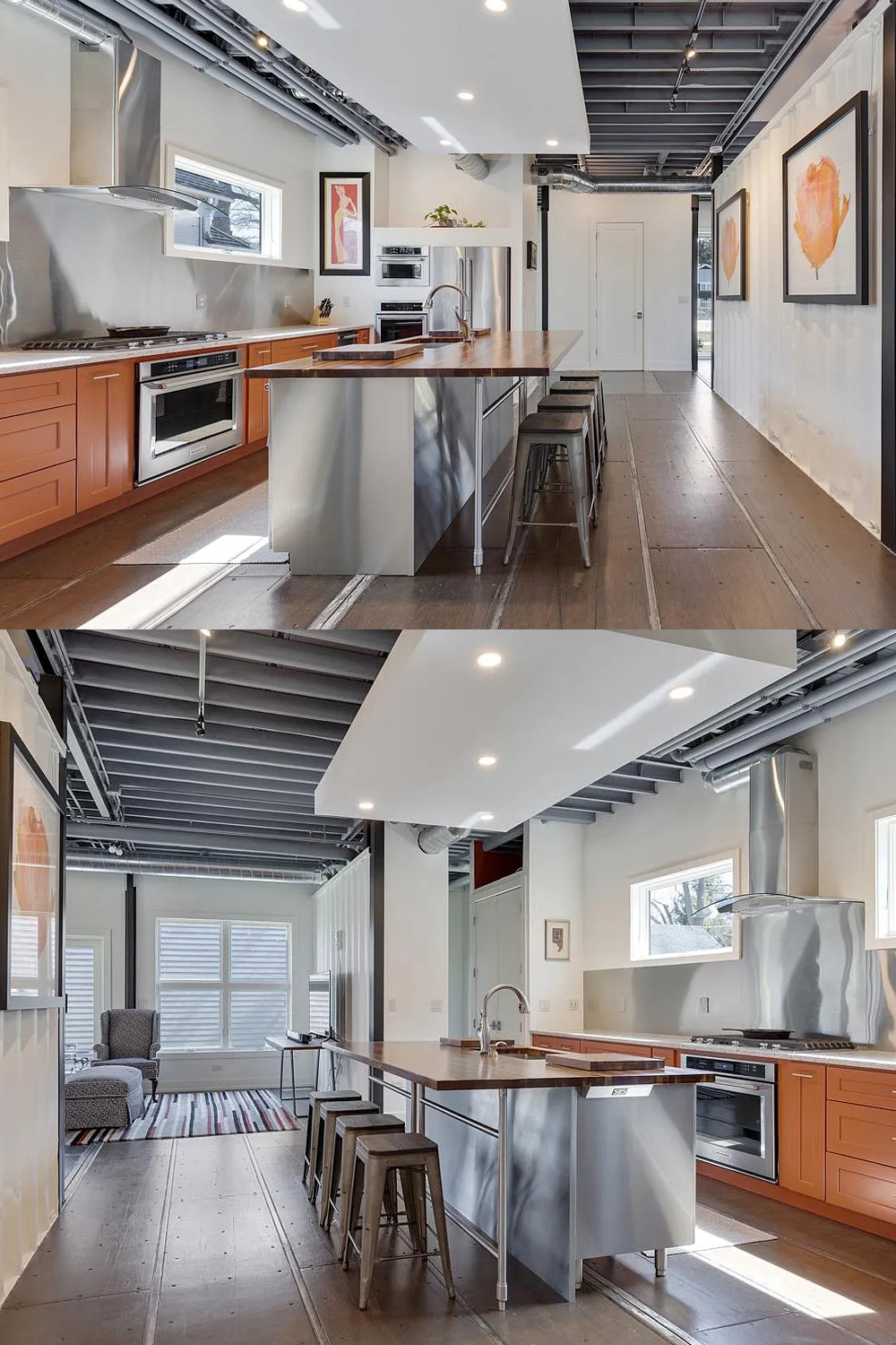 Now let’s check out the kitchen. This room is the heart of the home, and it shows. Stainless steel surfaces shine, bouncing light around the space. Orange lower cabinets add a burst of color and energy. The large island with metal stools is the perfect place for breakfast or quick snacks.