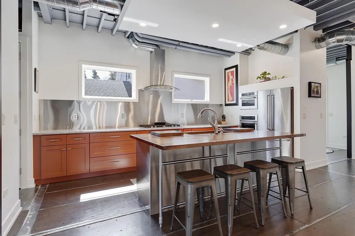 A wood countertop on the island adds warmth and balances out the cool steel. Sleek appliances and a vent hood blend in perfectly with the industrial look. The kitchen feels open, clean, and organized. There’s plenty of storage for everything, from pots and pans to snacks and dishes.