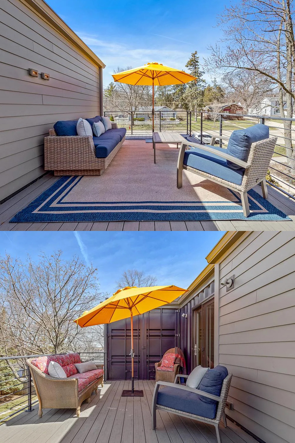 But the outdoor living doesn’t stop there. Head upstairs and you’ll find not one, but two balcony decks! These spaces feel like private escapes above the yard. One has a bright orange umbrella and a mix of comfy chairs and a sofa, perfect for sipping coffee in the morning sun. The other has deep blue cushions and another umbrella for shade, making it a great spot to read or hang out with family. A sturdy metal railing keeps everything safe and adds to the modern look.