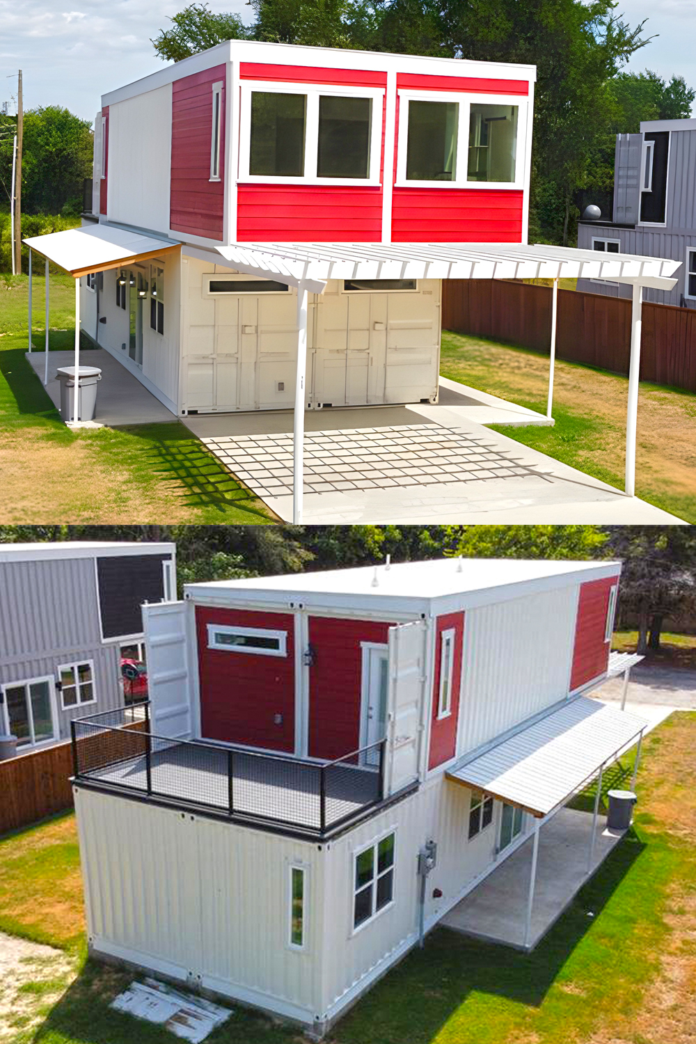When you see this house for the first time, you can’t help but stop and stare. It uses shipping containers for its main shape, but the look is anything but industrial. Clean white walls mix with bold red panels, giving the home a fresh and playful feel. The sharp lines and stacked layout turn the simple box into something special.