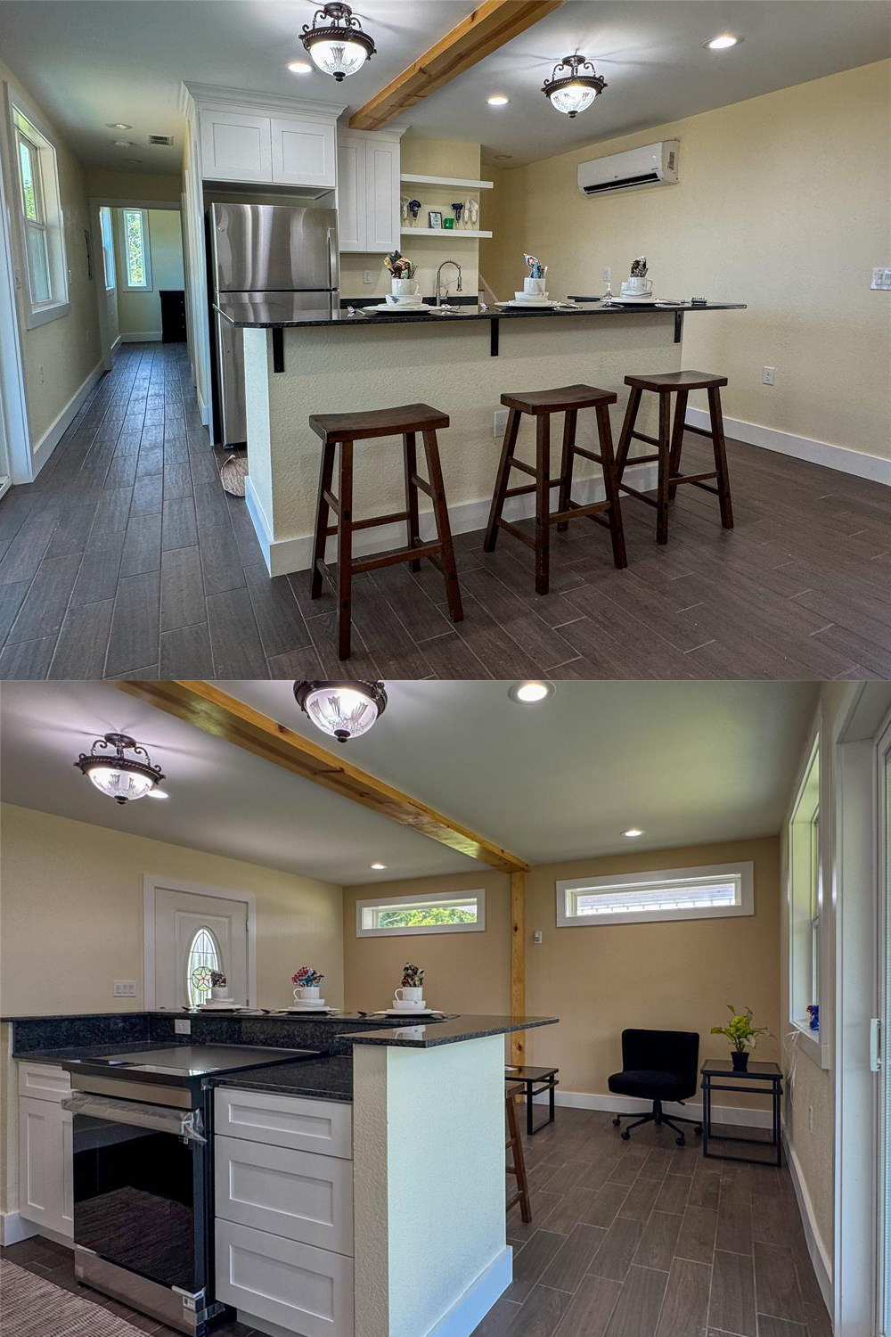 The kitchen in this home may be compact, but it has everything you need. White shaker cabinets give a classic look, while open shelves show off pretty dishes or favorite mugs. A black granite countertop adds a touch of luxury and makes cleanup a breeze.