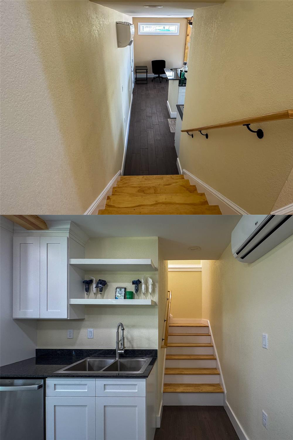 Next to the kitchen, you’ll find a set of simple wooden stairs. These lead up to the second floor, where the private rooms are. The stairs are tucked away but easy to reach, making the best use of every corner. Soft lighting on the steps keeps things safe and cozy at night.