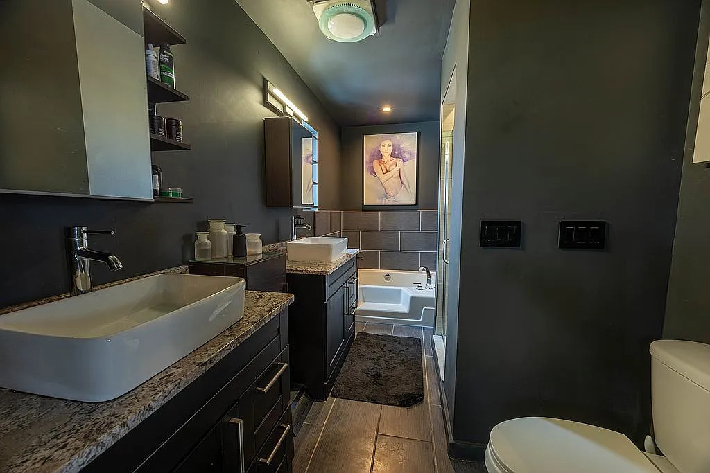 Step into the bathroom and you’ll feel like you’ve checked into a boutique hotel. Dual vessel sinks on granite counters give everyone plenty of space. Dark tile on the walls and floor provides a sleek backdrop, while the freestanding tub is the star of the show.