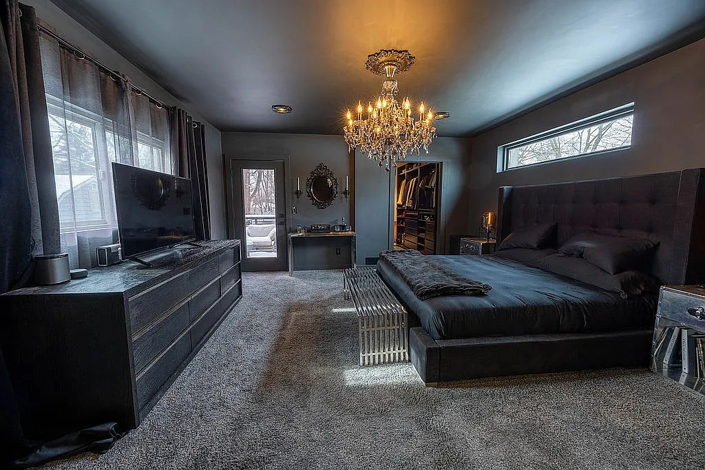 Dark and dreamy, the bedroom is a true retreat. A tall, tufted headboard sets the mood, while all-black bedding feels luxe and inviting. A sparkling chandelier is the unexpected centerpiece, adding classic glamour that pops against the moody color scheme.