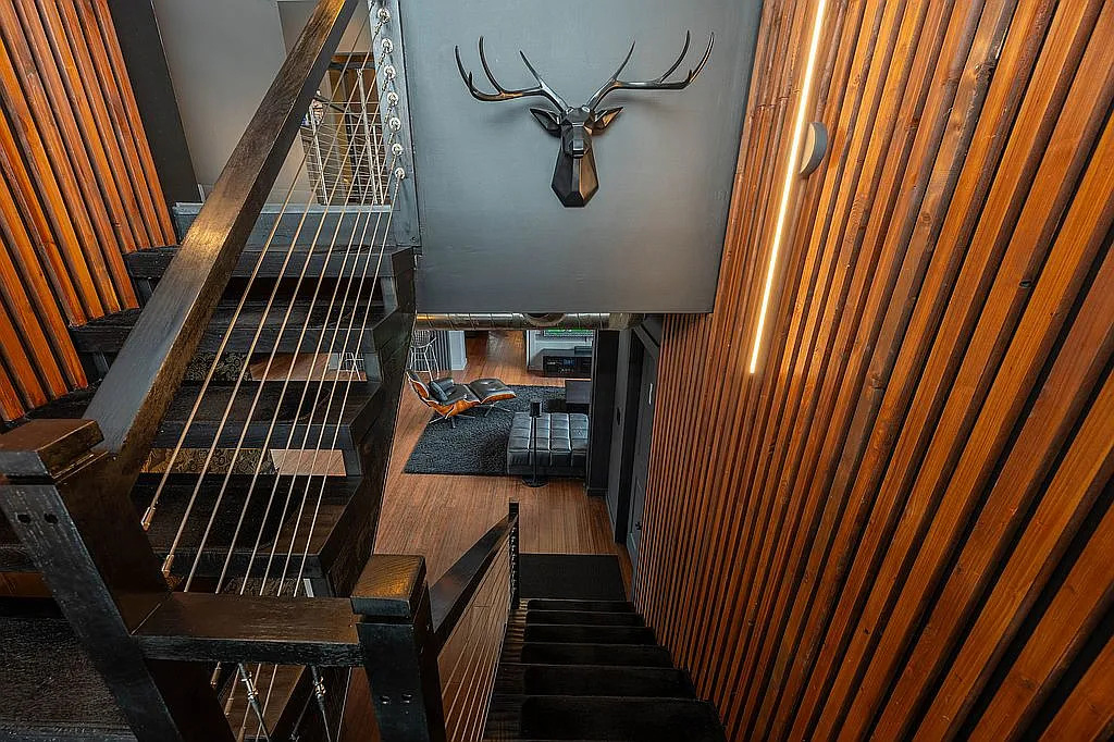 Moving between floors, the staircase is a real scene-stealer. Open risers, black railings, and cable wires keep things light and airy. Wood slats along the walls add warmth and contrast to the cool metal details. A mounted deer head above the landing brings a playful, rustic element.