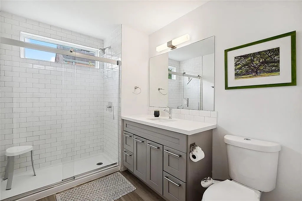 The bathroom is simple but stylish. A big glass shower stretches along one wall. White tiles keep things bright and easy to clean. There’s a handy bench in the shower, too.