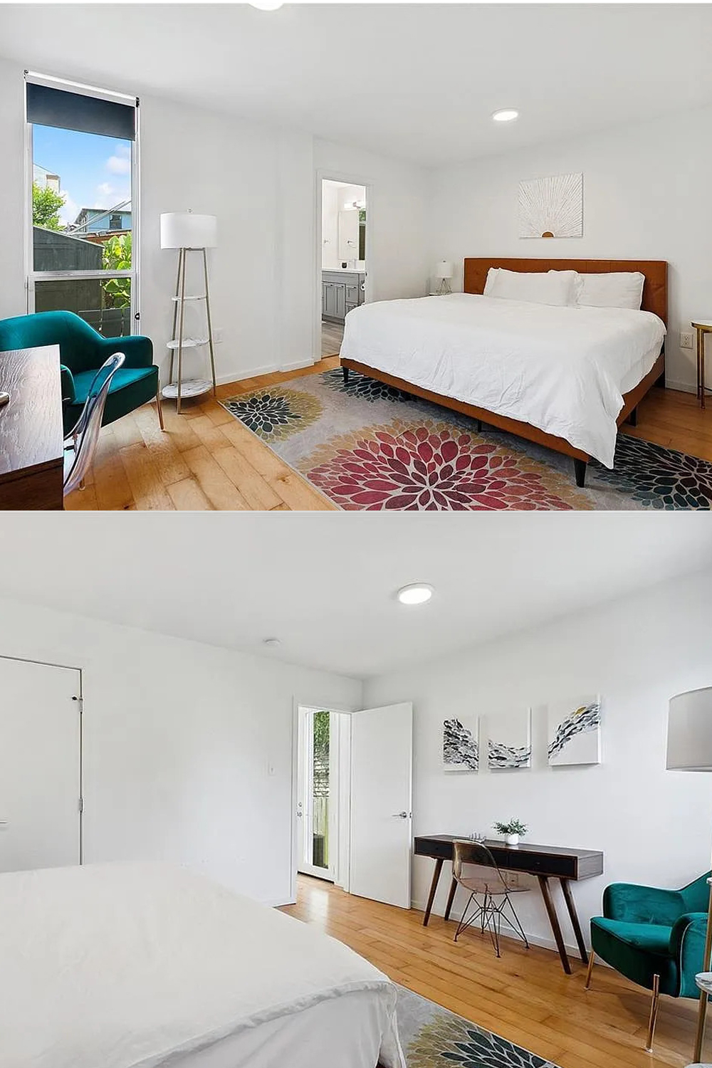 There’s also a cozy chair and a small desk, perfect for reading or getting work done. Simple, soft colors and a few art pieces make the room feel peaceful and calm.