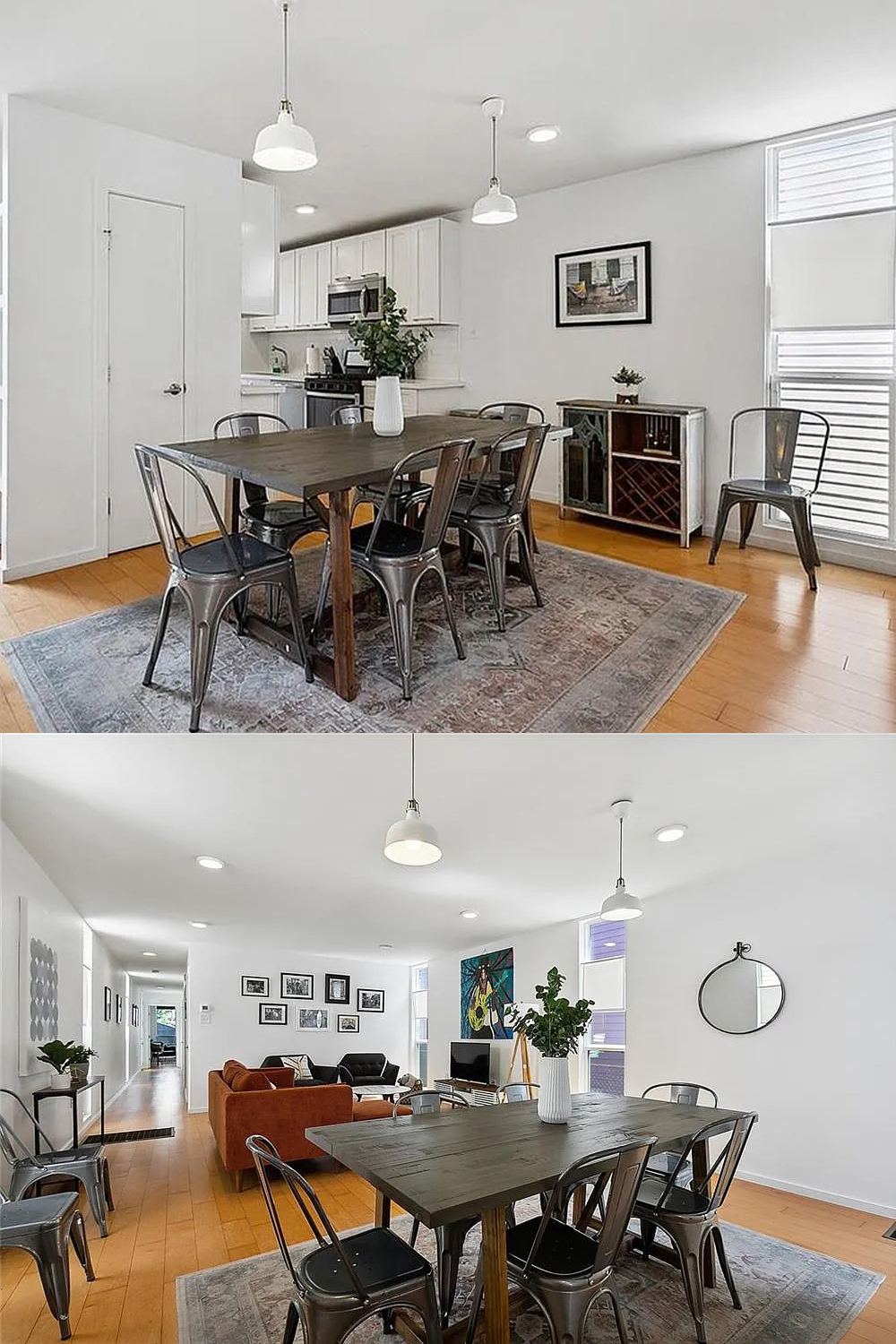 Right beside the living room is the dining area. There’s a wooden table with metal chairs—easy to clean, easy to move. Two simple lights hang above, making this a nice spot for meals or games.