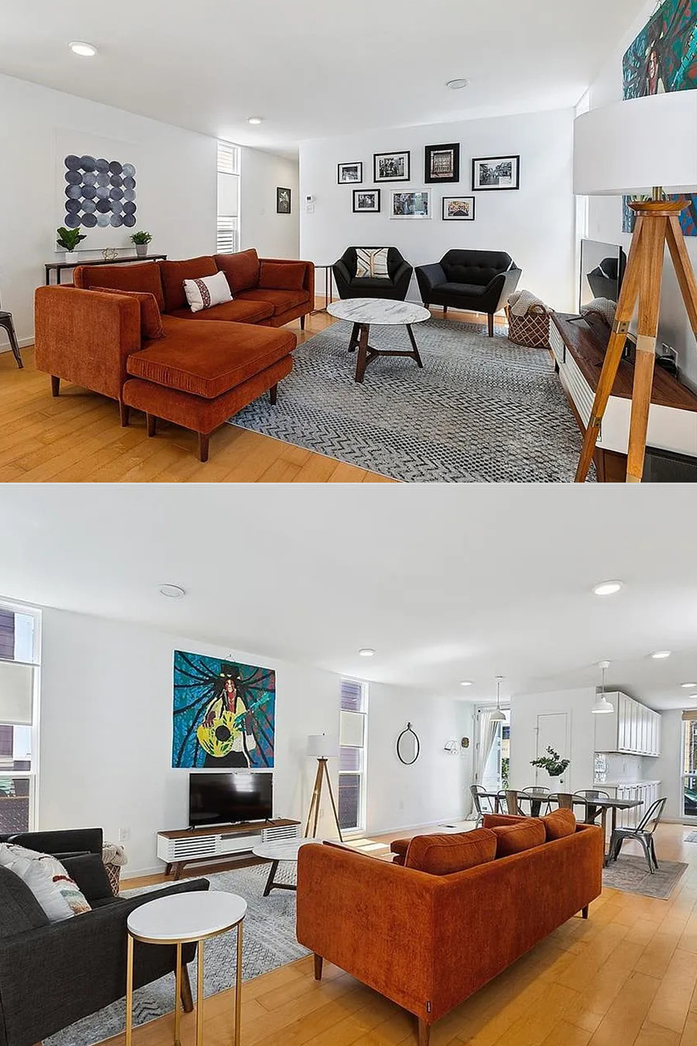 The living area has a comfy orange couch and two black chairs—just right for watching TV or chatting with friends. There’s a soft rug underfoot and simple art on the walls. Everything feels relaxed and open.
