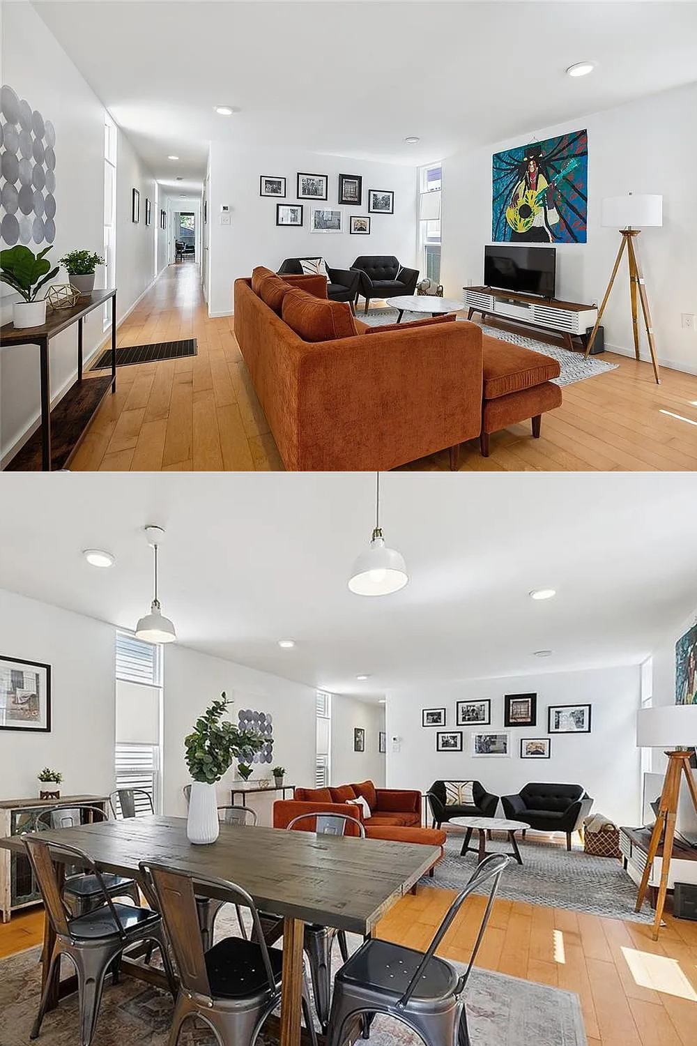 Step through the door and the first thing you’ll notice is all the light. Big windows and glass doors fill the space with sunshine. The floors are a soft, natural wood color, making the room feel warm and welcoming.