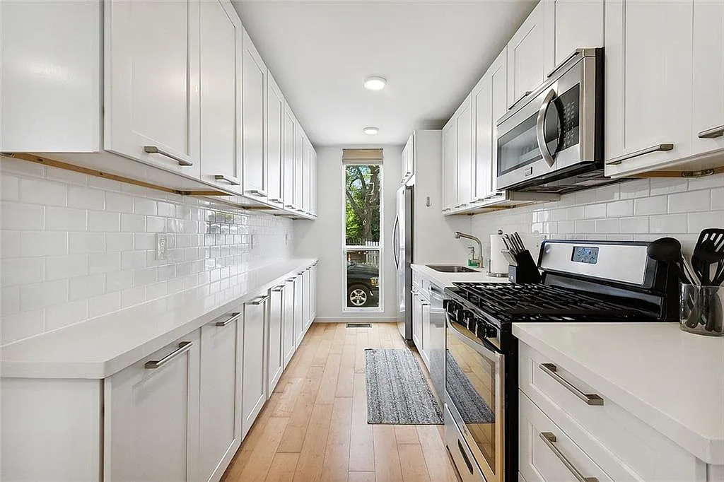 There’s a stainless steel stove and oven, a big fridge, and a microwave—all the basics you need. The window at the end brings in light and lets you look out into the yard while you cook.