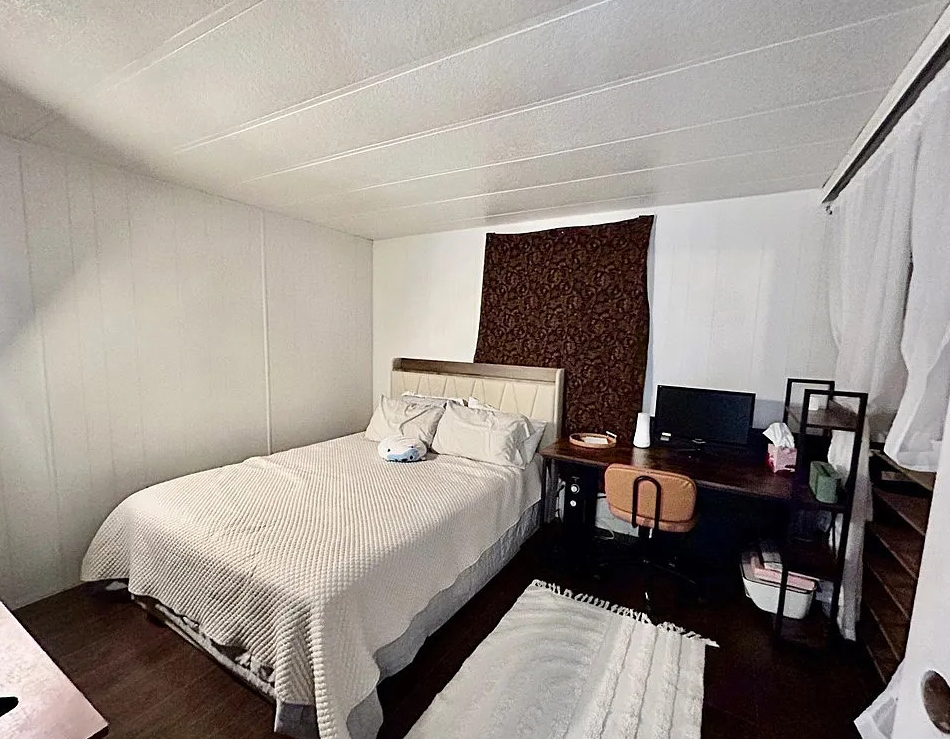 - Bed: A plush bed is made with creamy bedding and soft neutral pillows. The headboard adds just enough height to feel intentional without overpowering the small room.