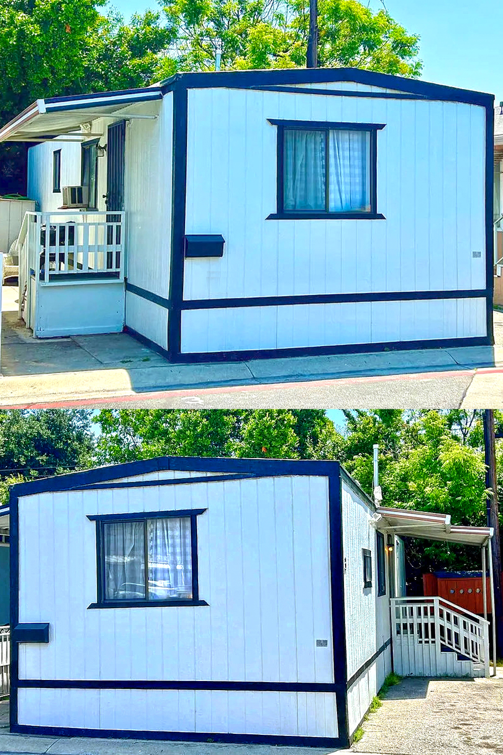 The outside of this mobile home keeps things clean and classic with white vertical siding and sharp black trim. It’s a smart contrast that adds instant curb appeal. The roofline has just enough slope to create definition, and the narrow overhang above the side entrance adds shelter and style without overwhelming the footprint.