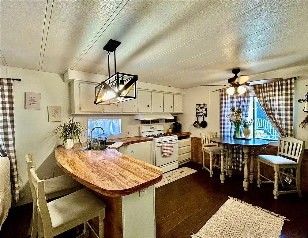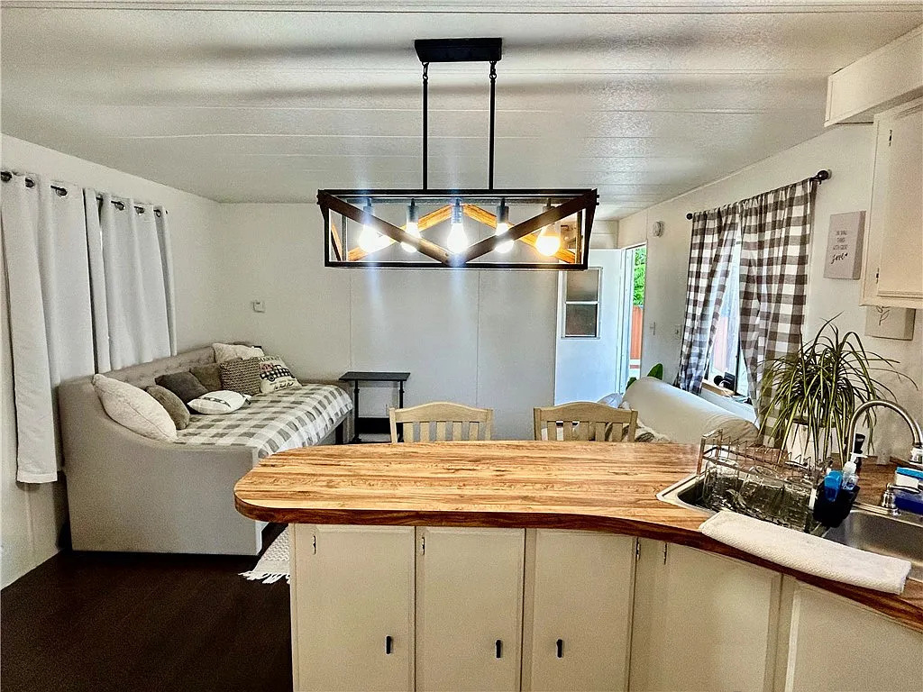 Step through the door, and you’re immediately drawn into a cozy L-shaped kitchen that feels both vintage and fresh. The layout is tight but practical, with plenty of warmth from the butcher-block-style counters.