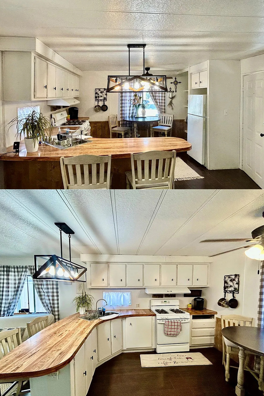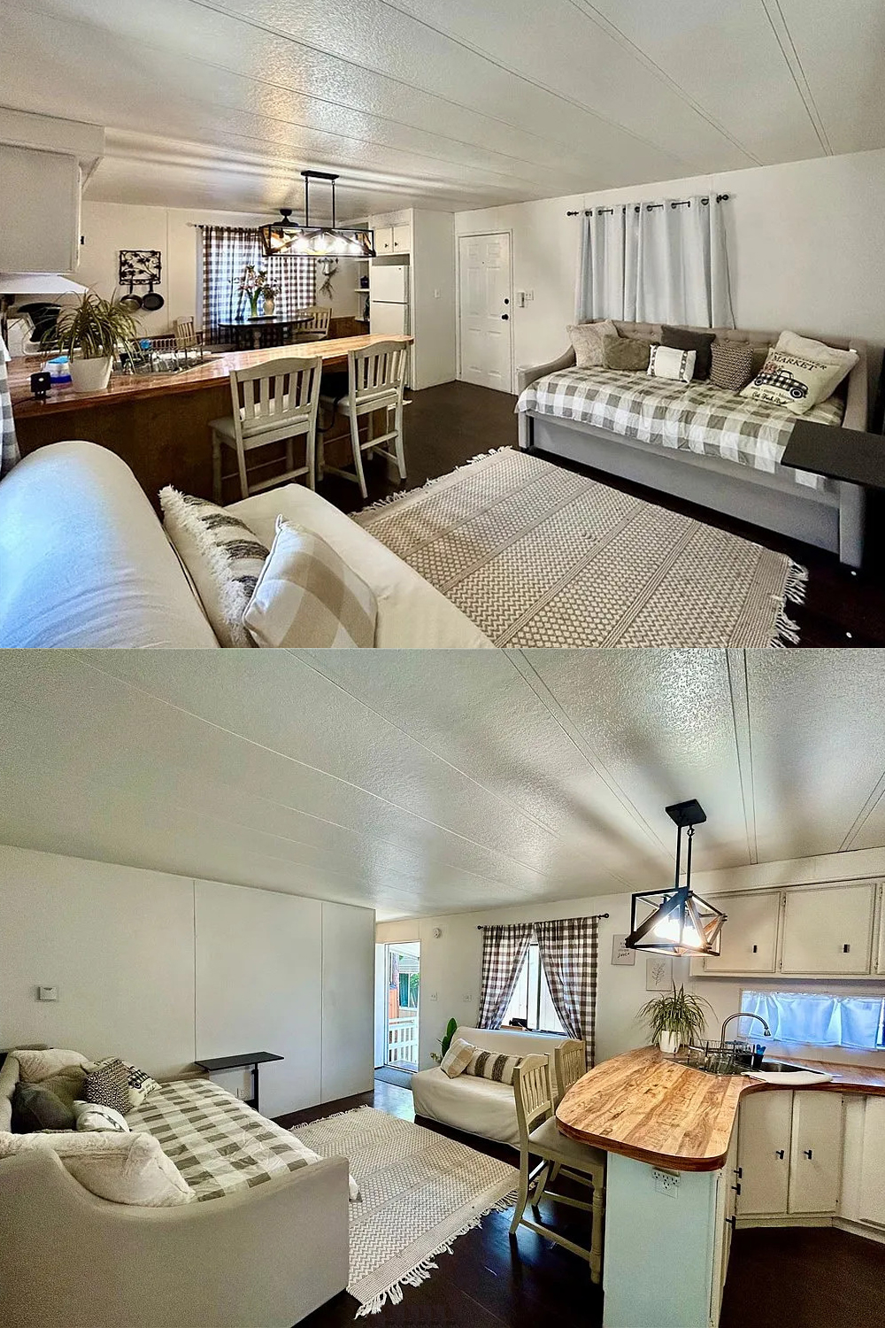 This mobile home proves that small can be stunning. With the right mix of warm textures, simple colors, and farmhouse charm, it feels cozy and full of life.