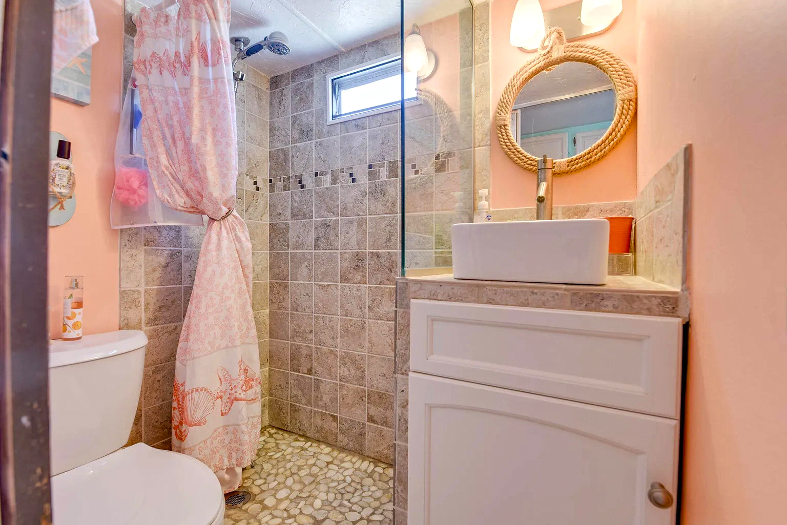 The bathroom is small but stylish. Coral walls add warmth and match the theme from the bedroom. The shower is lined with stone-look tile, and the floor is covered in smooth pebble tile for a spa vibe.