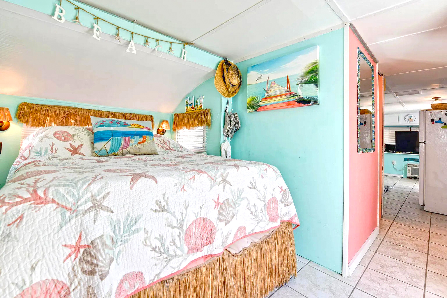 The bedroom is pure beach getaway. A seashell quilt in coral and pink tones sets the mood. The bed is framed with faux grass fringe along the top and bottom, adding a tiki-style edge.