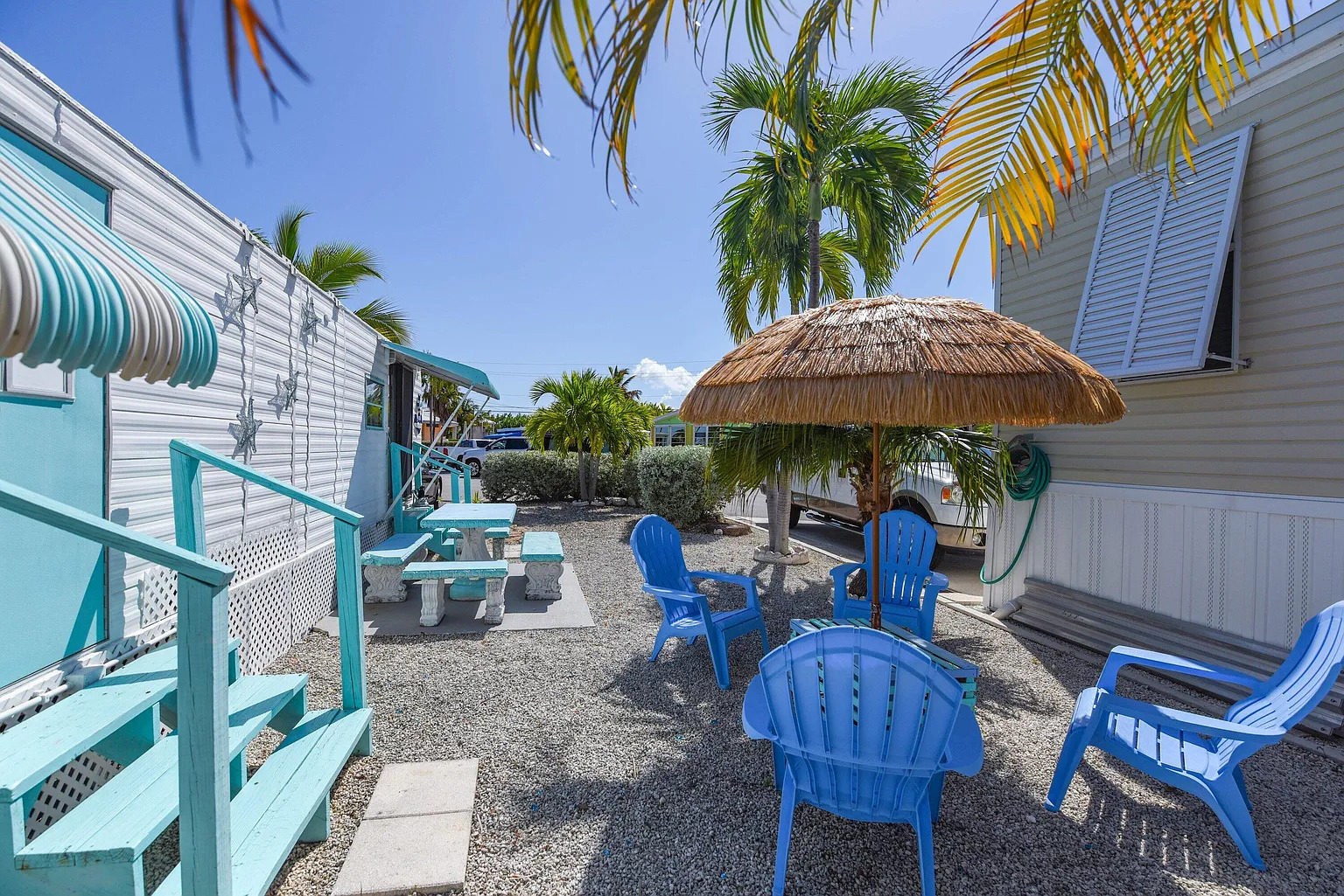 Outside, this home really shines. The gravel yard is set up for easy living—no mowing required. There’s a full tiki-style seating area with four Adirondack chairs and a thatch umbrella. It feels like your own little beach bar.