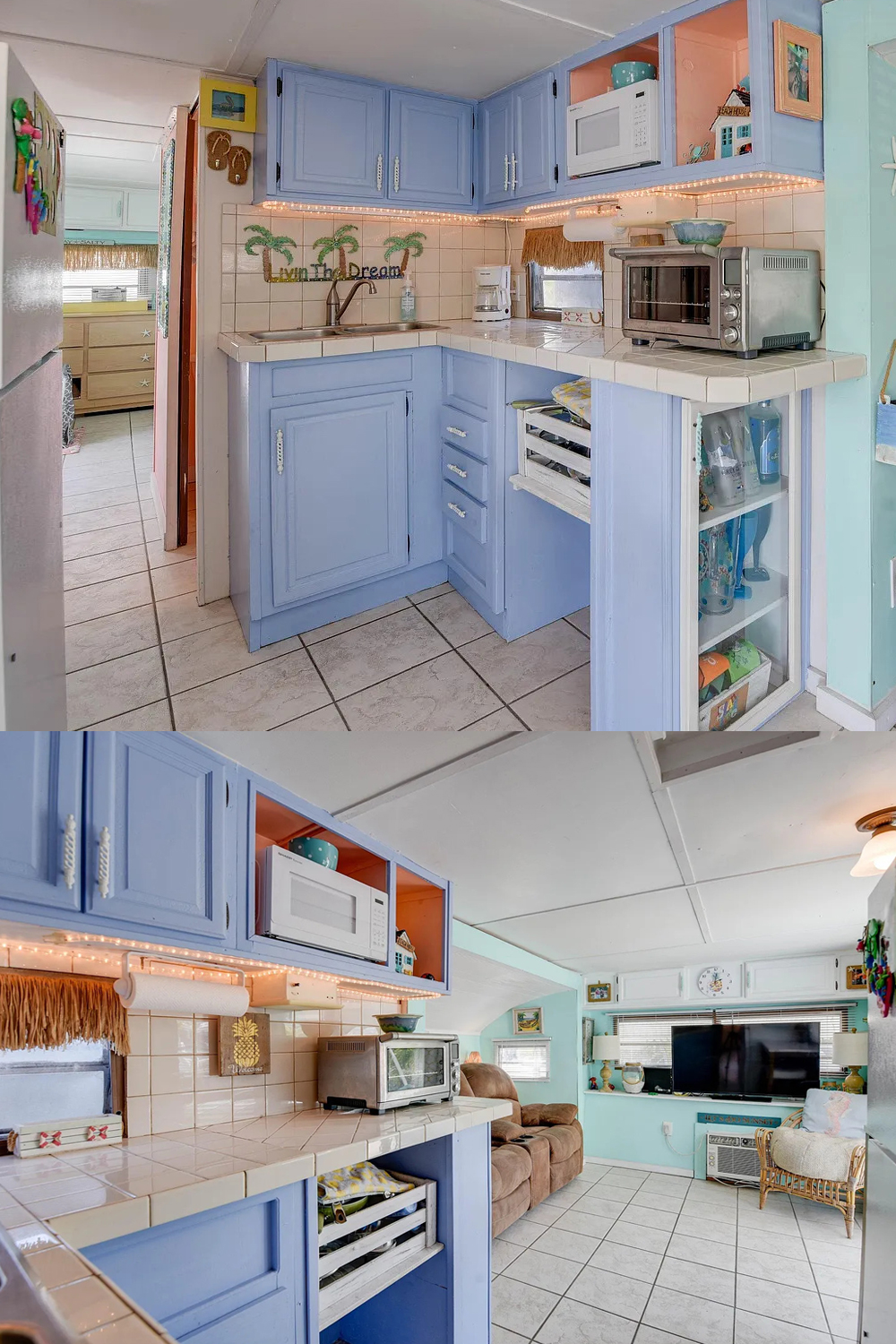 Counters are tiled in white with light grout. Under-cabinet lights add a warm glow and highlight a mural that reads “Livin’ the Dream” complete with palm trees. Appliances are tucked in neatly: a small oven, microwave, and coffee maker—everything you need, nothing you don’t.