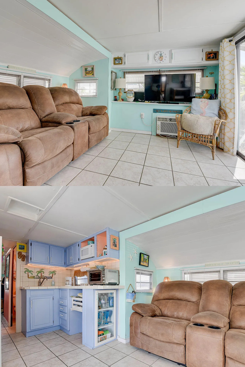 This single wide may be small, but it’s bursting with personality. Each room leans into the beach theme without being overwhelming. Light colors, cozy textures, and playful accents make it feel like a vacation spot all year round.