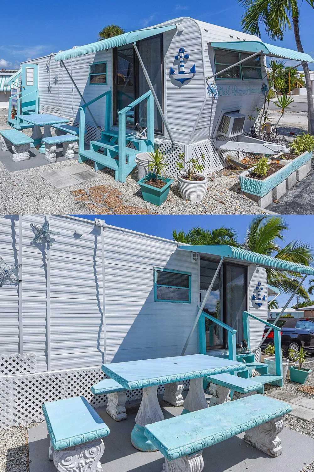 This mobile home is proof that small spaces can pack in big style. Every corner says beach life, from the anchor on the wall to the seashell quilt on the bed. It’s fun, relaxed, and practical—all at once.