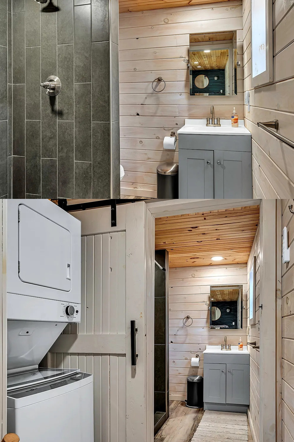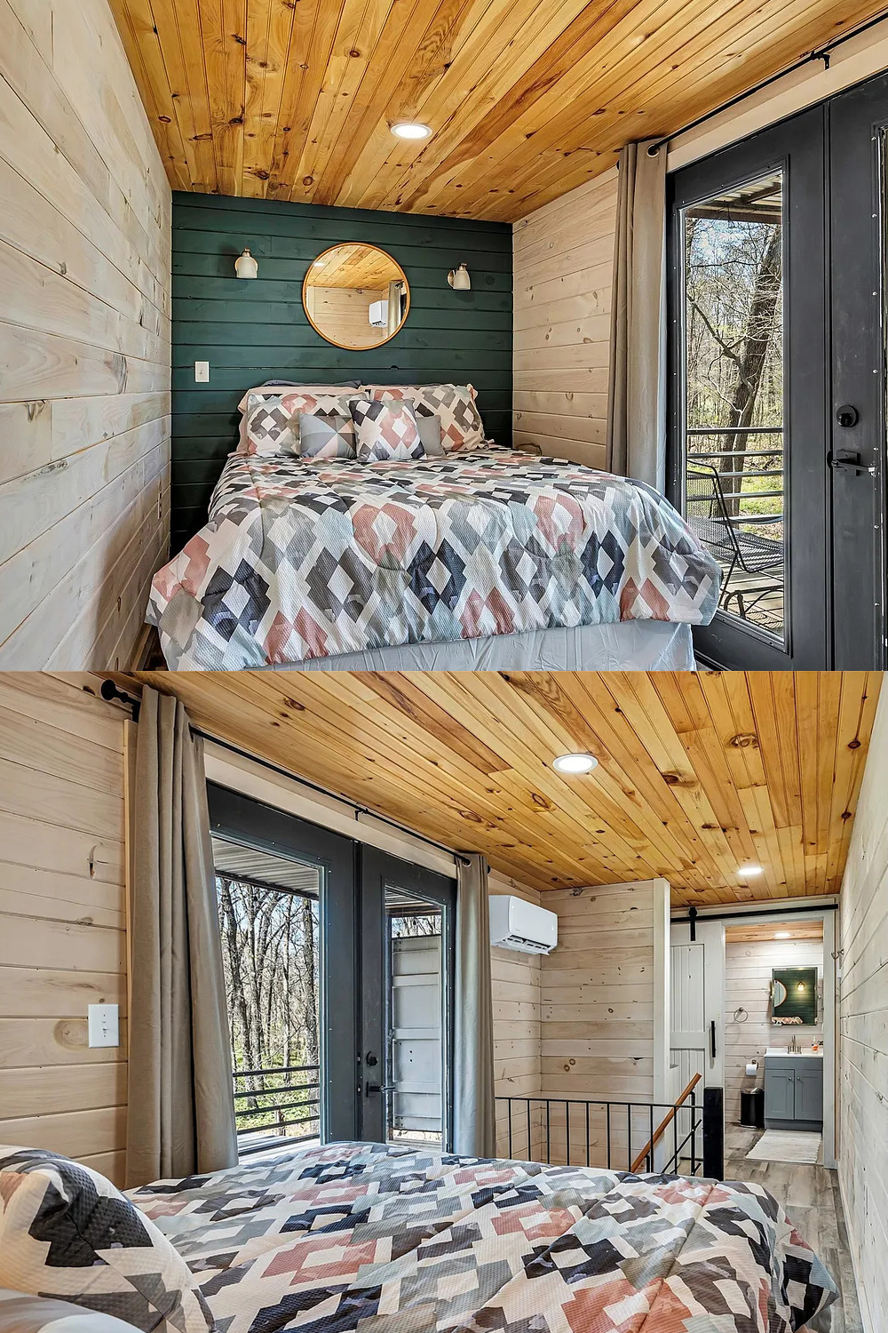 Head upstairs or around the corner, and you’ll discover the cozy bedroom. A soft wood ceiling and walls continue the cabin feel, but the deep green accent wall behind the bed adds a modern touch. Two small sconces provide nighttime reading light, and a round mirror reflects light, making the room feel bigger.