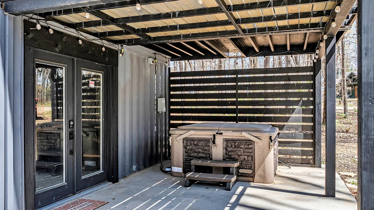 This container house is designed to bring the outdoors in. Downstairs, the concrete patio is shaded by the upper balcony. A hot tub sits in a private nook, offering a spot to soak and unwind. There’s also a picnic table and lounge chairs, perfect for summer dinners or lazy afternoons.