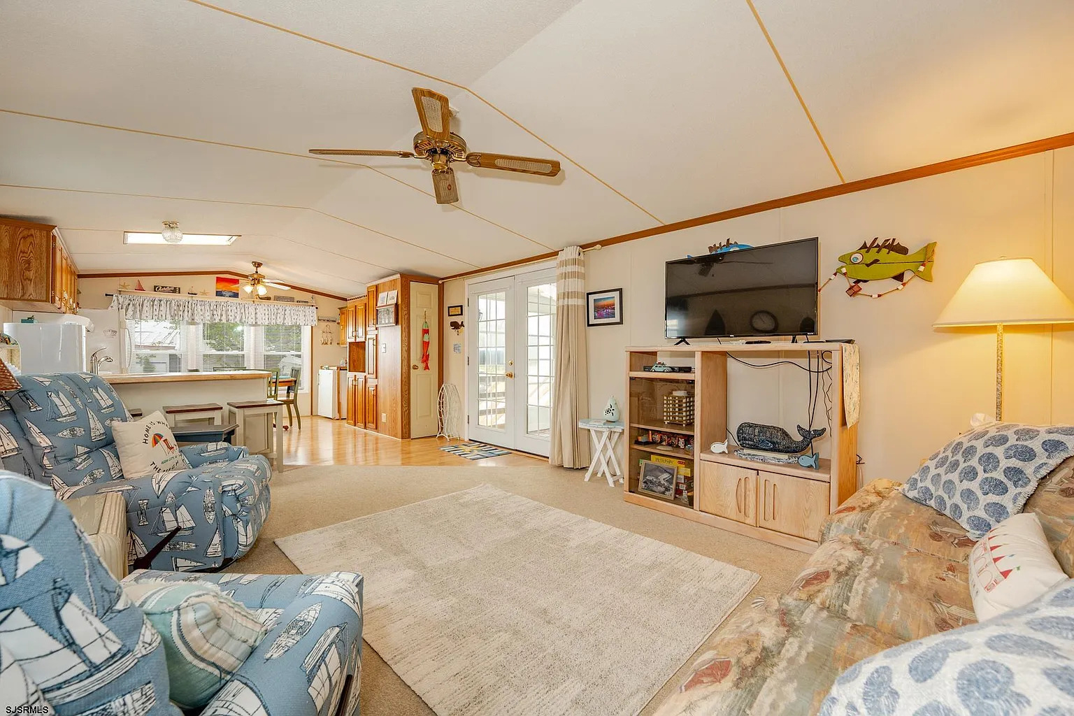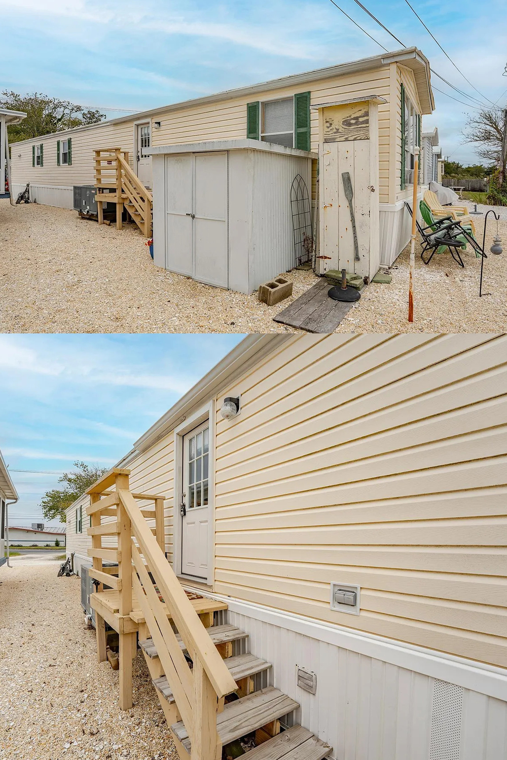 This single wide mobile home greets you with warm, welcoming vibes right from the start. The exterior shines in a soft cream-yellow vinyl siding, which instantly feels sunny and fresh. Classic green shutters frame the windows and add a pop of color that feels both traditional and beachy. Simple steps and sturdy railings lead up to the entry, making the home feel approachable and easy to access.