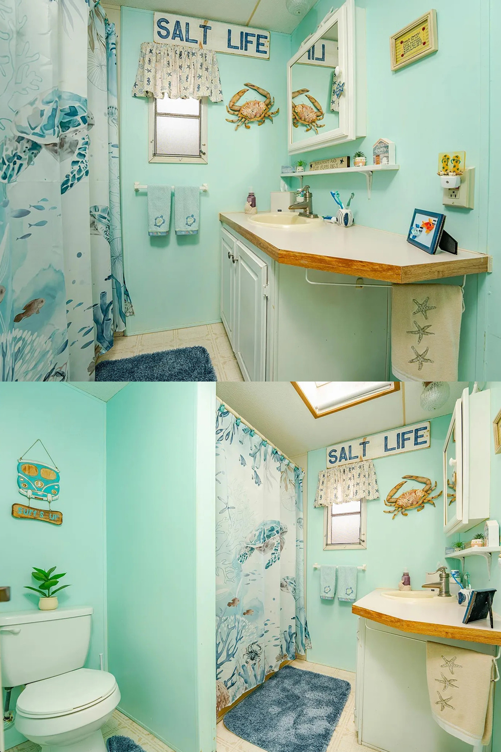 This bathroom is a splash of joy, painted in soft aqua blue. The shower curtain features turtles and coral, while a sign above the window declares “Salt Life”—driving home that you’re living the dream.
