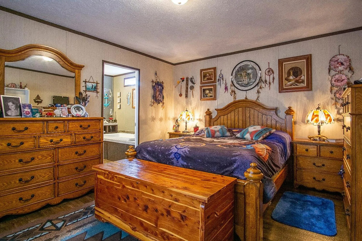 The bedroom is warm and restful. The big wooden bed feels strong and cozy. Matching dressers and a chest sit nearby. Lamps on the nightstands cast a soft glow.