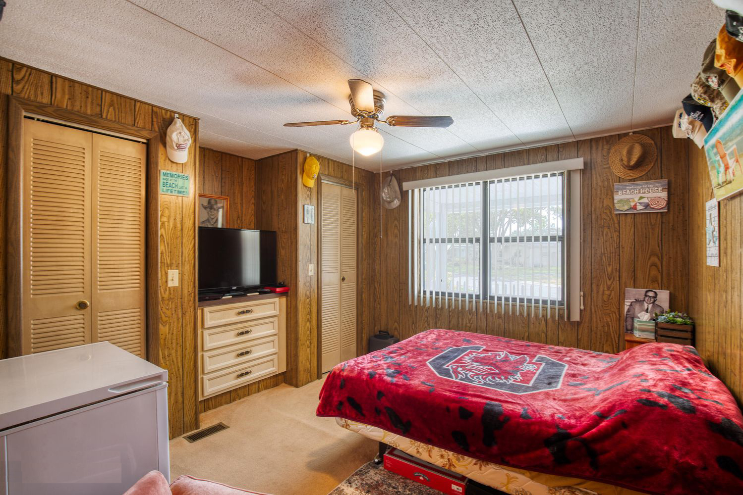 The bedroom is perfect for rest. Warm wood paneling covers the walls. A big window lets in gentle sunlight. A ceiling fan helps you stay cool. There’s a dresser built in, and lots of closet space.