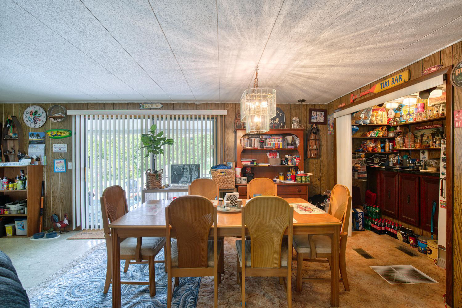The dining room sits between the kitchen and living room. A big wooden table is ready for breakfast or board games. Light shines in from the sliding glass doors. The doors lead right out to the porch, so you can carry your meal outside when the weather’s nice.