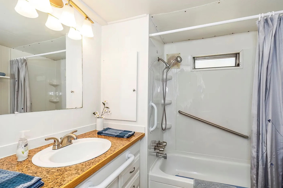 The bathroom uses its space wisely. The long vanity offers storage, counter space, and a wide mirror. This helps the room feel bigger right away.