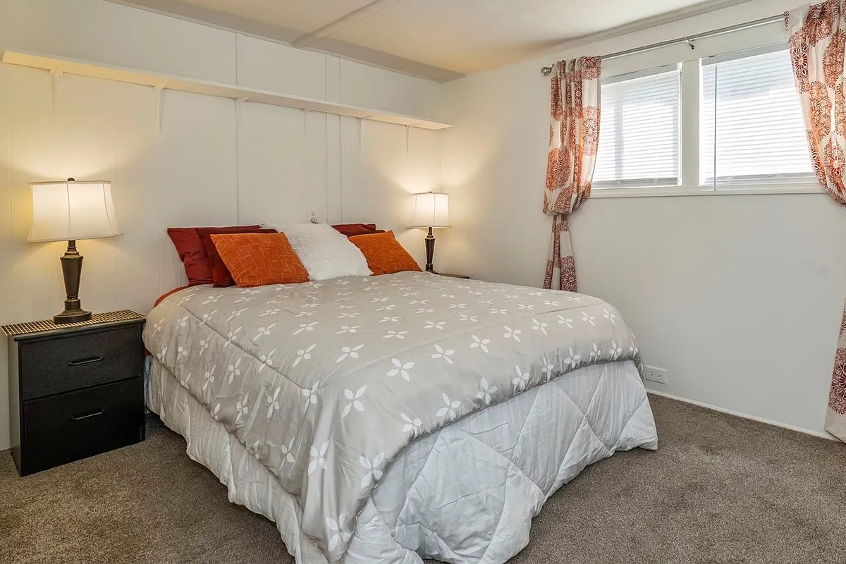 The bedroom uses warm shades to create a cozy retreat. Orange patterned curtains bring energy, while the bedding stays soft and neutral. Together, they keep the room balanced and inviting.