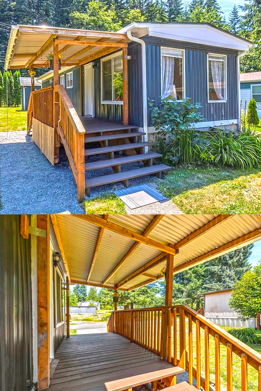 The railing and steps add a friendly, welcoming touch. They also balance the darker siding. The mix of wood and metal creates a nice blend of rustic and clean design.