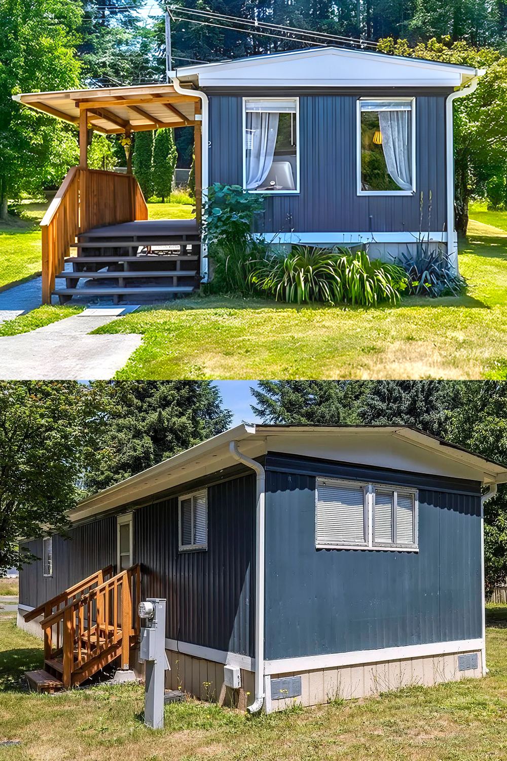 The yard wraps around the home with soft grass and mature trees. The greenery lightens the dark siding. It also brings a peaceful, park-like feel. You can picture yourself sitting on the porch while the breeze moves through the trees. The yard keeps the home light and open, even with the darker exterior palette.