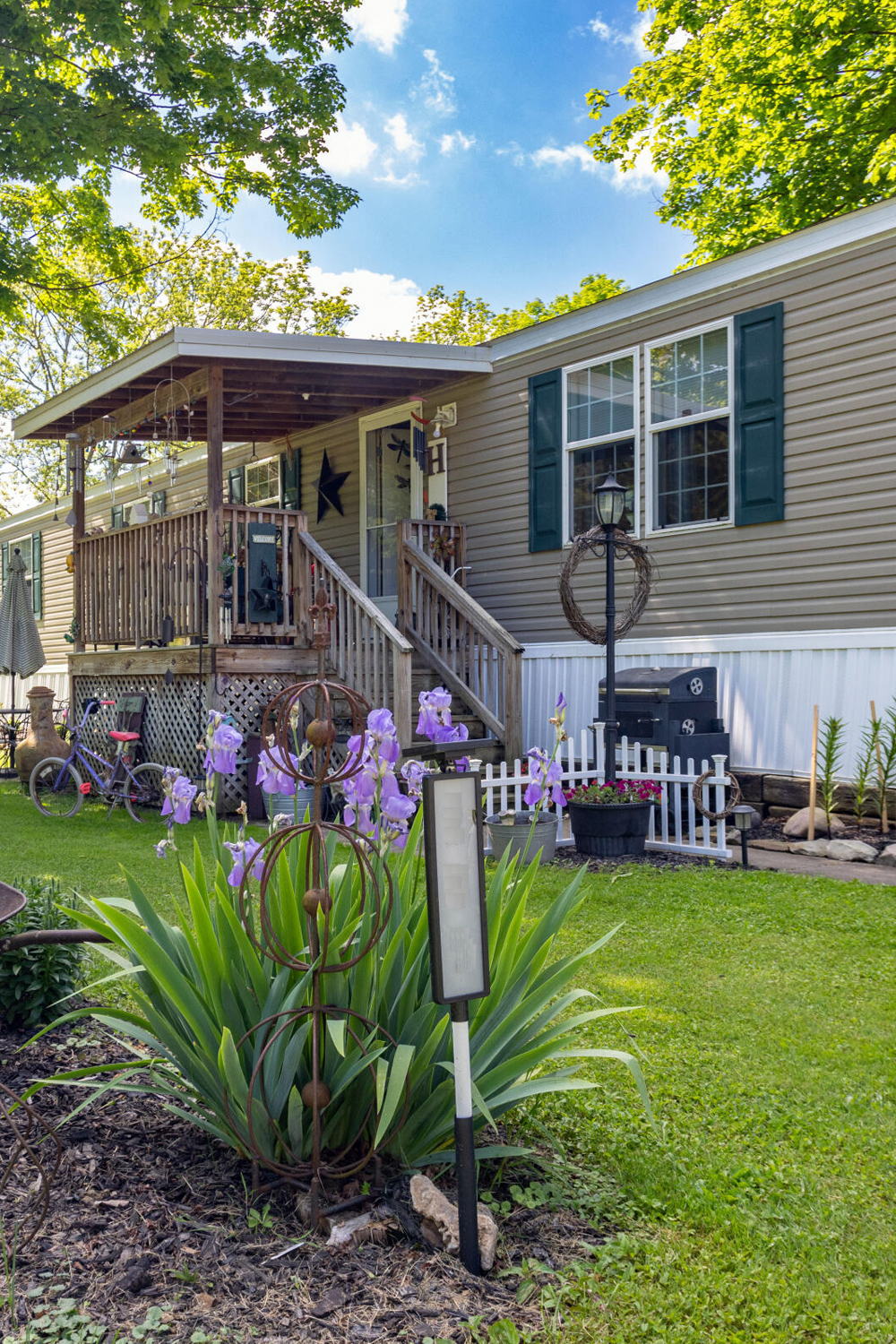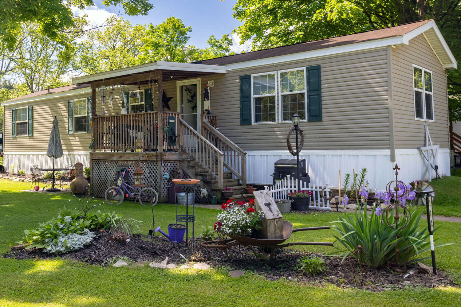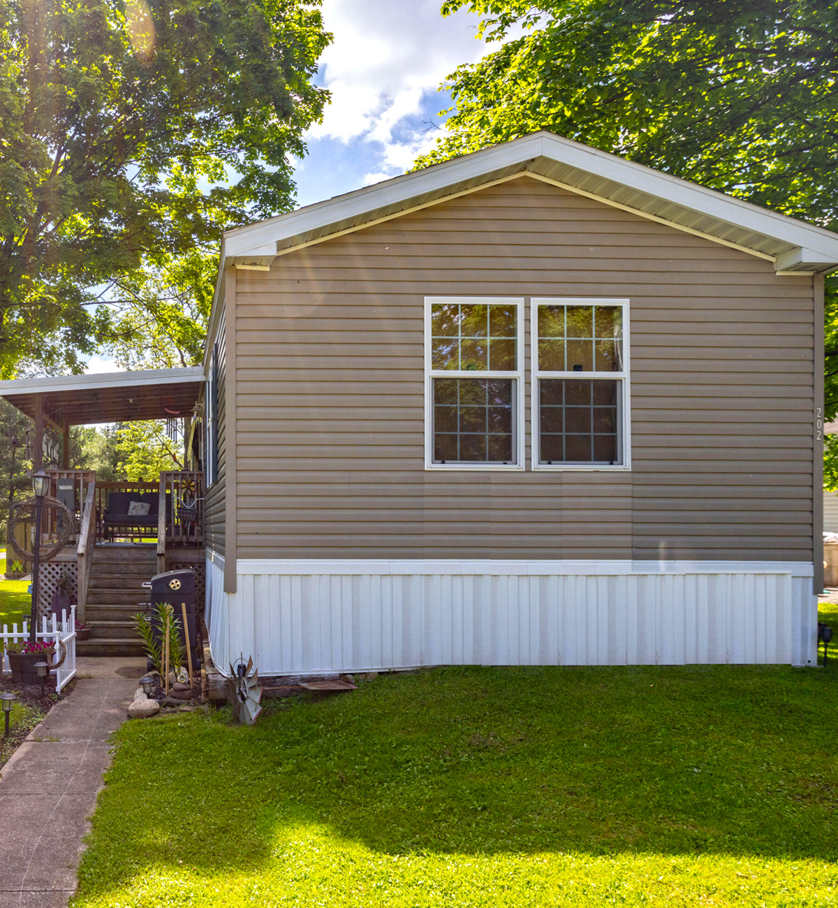 The outside of this home feels friendly right away. The light brown siding is neat and classic. Bright white skirting at the bottom keeps things fresh. The yard is green and full of life. There are tall trees, lots of grass, and blooming flowers.