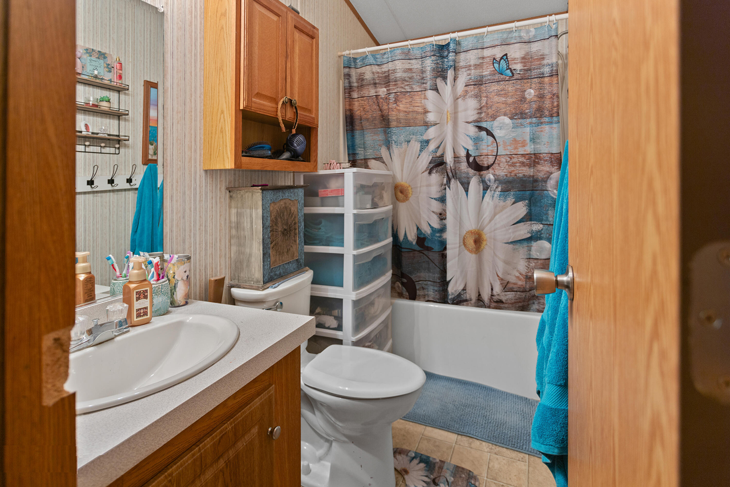 Even the bathroom feels happy. The shower curtain is full of big daisies and soft blues. The walls have simple stripes. There’s a wood cabinet for storage. Blue towels and mats match the curtain.