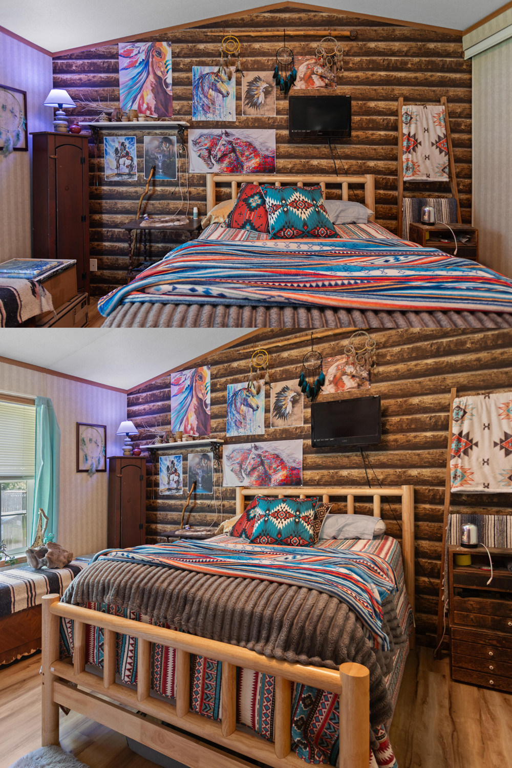 The bedroom feels like a cabin getaway. The wall behind the bed looks like real logs. The other walls are light and striped. Curtains are a soft sky blue. The bedspread has bright, southwest patterns. Over the bed, art and dreamcatchers hang. Plants and wood pieces sit near the window.